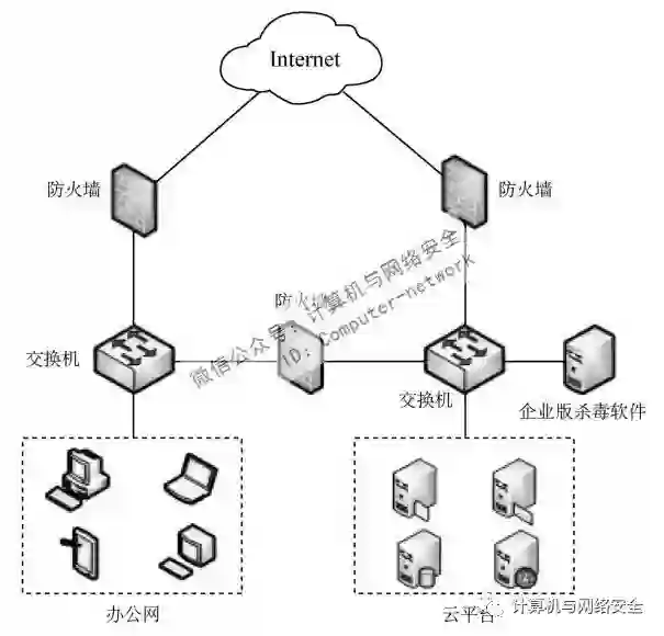 恶意代码一般通过网络和主机两个层面进行破坏,一旦恶意代码突破网络层安全防护,在网络内部传播,主机就非常容易被感染。同时,通过各种移动存储设备接入也可能造成主机感染,所以应在网络和设备处同时防范。一般在主机和终端设备安装网络版防病毒软件(防病毒软件部署示意图见图5)并及时更新病毒库进行有效防护控制,实现系统运行过程中重要程序或文件完整性检测,并在检测到破坏后通过备份进行恢复。