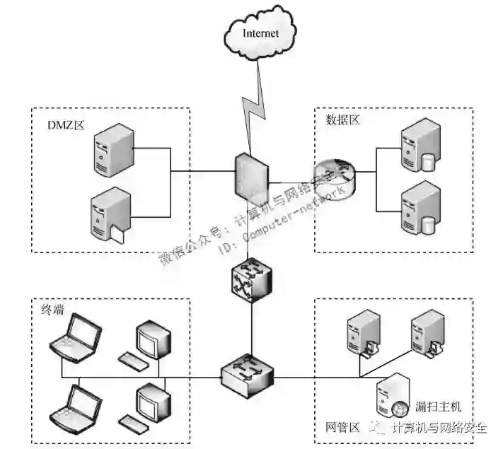 在等级保护安全体系规划中,访问控制的要求贯穿了各个层级,可以说网络安全的防护就是要对访问控制进行安全防护。相比物理层、网络层通过部署有关安全产品实现访问控制,满足等级保护要求,在设备和计算安全中主要就是通过对设备的操作系统进行安全配置,合理加强访问控制安全措施,防止内、外非法用户攻击,保障主机安全。安全准入和终端管理部署示意图如图2所示。