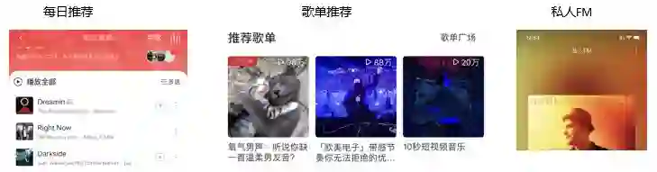在音乐推荐的实际应用场景中,采用了AI 技术来分发歌曲与歌单。其中比较典型的应用是:每日歌曲和私人 FM,它们能够根据个性化的场景,进行相关曲目的推荐。