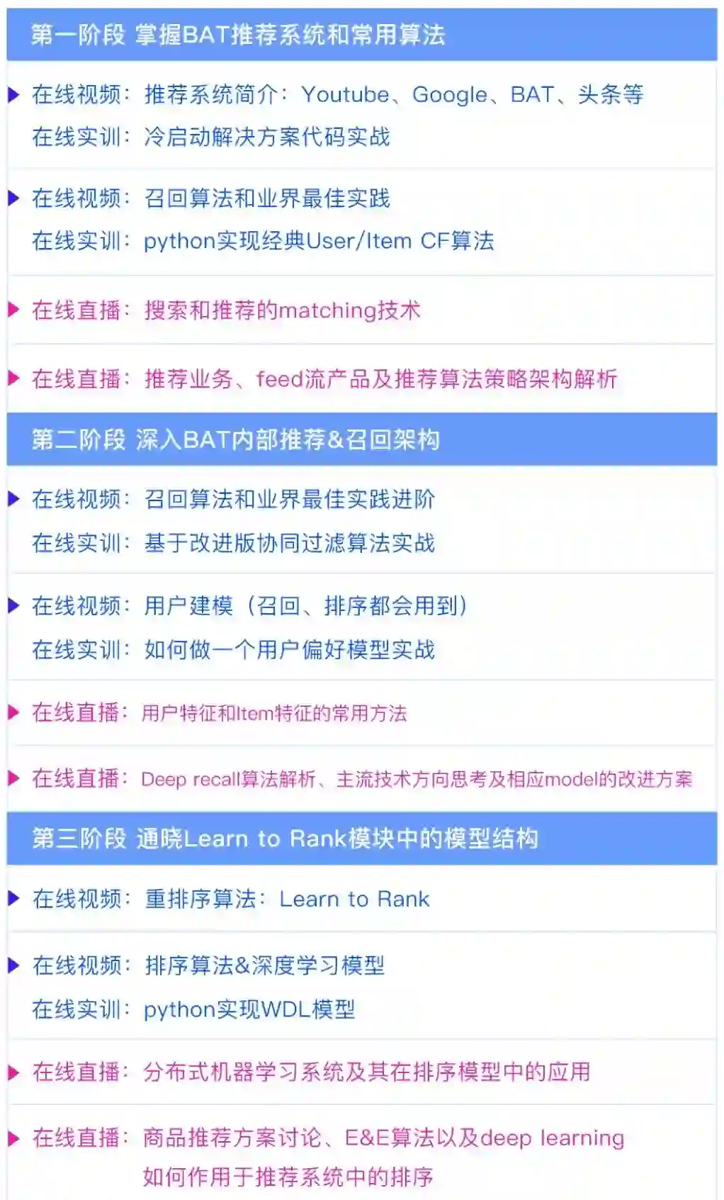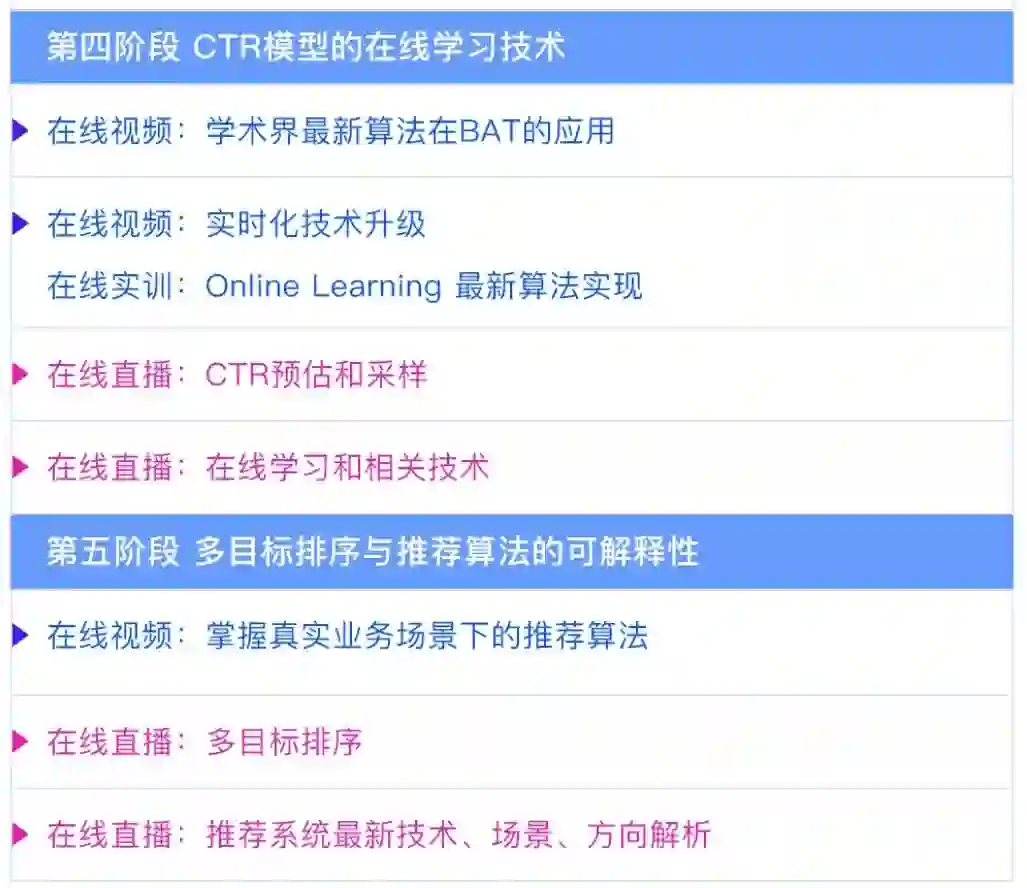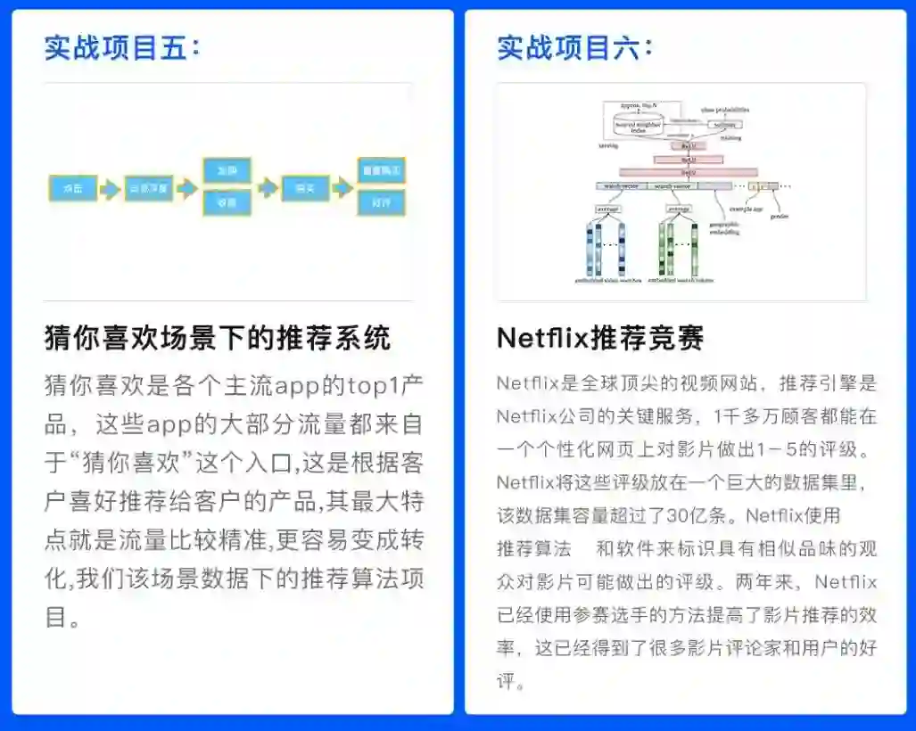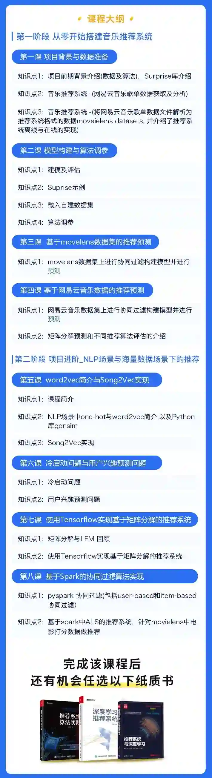 课程的主要内容包括:歌单数据解析、Surprise库的使用、基于Surprise的矩阵分解实现、基于Tensorflow的矩阵分解实现、基于pyspark的协同过滤实现、基于协同过滤的推荐系统实现、歌曲序列建模、冷启动问题等。