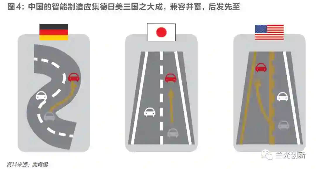 中国的智能制造在快速追赶,但制造业整体大而不强的现状还远未改写。如果把智能制造比作一场长跑,那么大多数中国企业还处在第二、第三军团位置。智能制造是一场非常规的长跑,是一场没有规定赛道的长跑。笔者相信,选择赛道是摆在企业家面前的考题,而答案很可能是兼容并蓄,集之大成(见图4)。与我们同时奔跑的德国、日本和美国,都具备各自的发展优势和可取之处。中国唯有潜心汲取其他制造强国的“武功秘籍”,并化为自己的“内力”,才能后发先至。