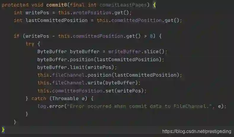 尽管 RocketMQ 与 Kafka 都支持 FileChannel 方式写入,但 RocketMQ 基于 FileChannel 写入时调用的 API 却并不是 transferTo,而是先调用 writer,然后定时 flush 刷写到磁盘,其代码截图如下: