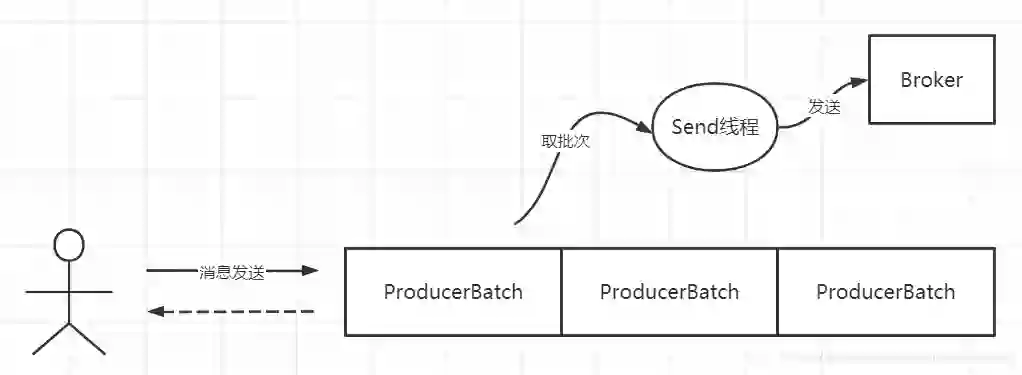 客户端通过调用 kafka 的消息发送者发送消息时,消息会首先存入到一个双端队列中,双端队列中单个元素为 ProducerBatch,表示一个发送批次,其最大大小受参数 batch.size 控制,默认为 16K。然后会单独开一个 Send 线程,从双端队列中获取一个发送批次,将消息按批发送到 Kafka集群中,这里引入了 linger.ms 参数来控制 Send 线程的发送行为。