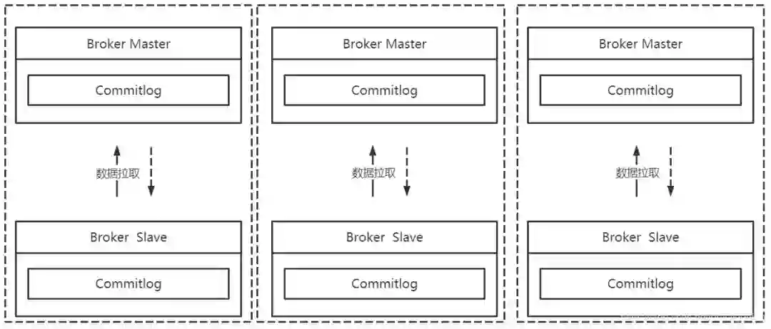 RocketMQ 默认采取的是主从同步,当然从RocketMQ4.5引入了多副本机制,但其副本的粒度为 Commitlog 文件,上图中不同 master 节点之间的数据完成不一样(数据分片),而主从节点节点数据一致。