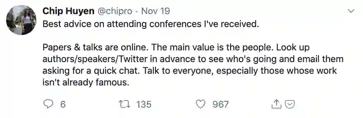 不过,即便这么说了,对大多数参会者来说,认识更多的人确实是他们的主要参会目标。正如 Chip Huyen 所说,你随时都有机会在电脑上浏览别人的论文、在视频网站上看别人的演讲回放;而和别的研究者当面聊聊,发掘一些还不出名但是很有潜力的研究成果/研究人员,在会议期间是最方便的。