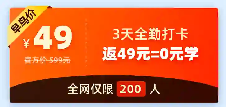 你只需支付 49元 的预定金,然后做到 3 天全勤打卡 , 49 元预定金会在结课后 3 天内全部退给大家。这些个标准其实并不难,如果你态度认真,努努力就能做到。