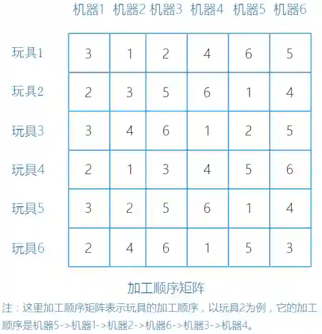 其中,加工顺序矩阵中的数字,代表玩具在各台机器的加工顺序;而加工时间矩阵中的数字,代表玩具在各台机器加工所需要的时间。