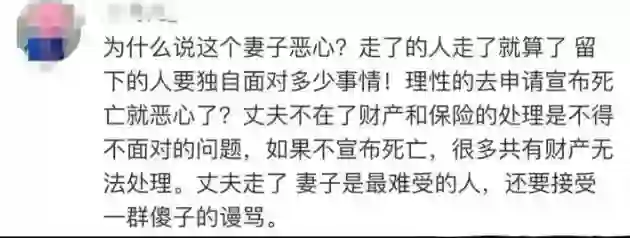 也有网友表示理解妻子阮素蓉的处境,丈夫的离世本身就很痛苦了。容新走后,活人还要继续面对现实,理性地处理财产和保险,情和理难两全。