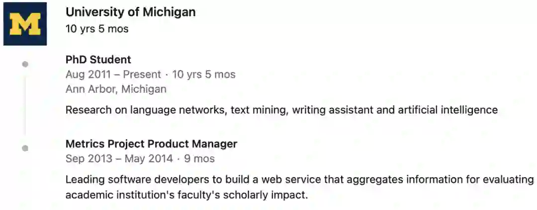 2011年毕业后赴美留学,在密歇根大学攻读博士学位,研究方向为语言网络,文本挖掘等。