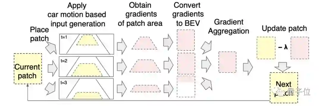 基于这样的目标函数,可以得到每个摄像机输入的梯度。但梯度下降并不能直接适用于更新恶意路面修复补丁。