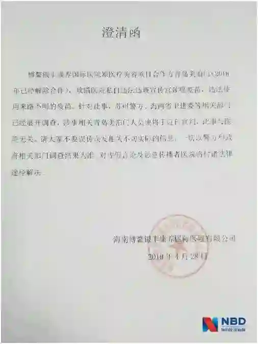 此外,记者从一名受害人处获悉,博鳌银丰康养国际医院给他们发来一份澄清函,称原医疗美容项目合作方青岛美泊门,欺瞒医院私自违法违规宣传宫颈癌疫苗,违法使用来路不明的疫苗。此事与医院无关。