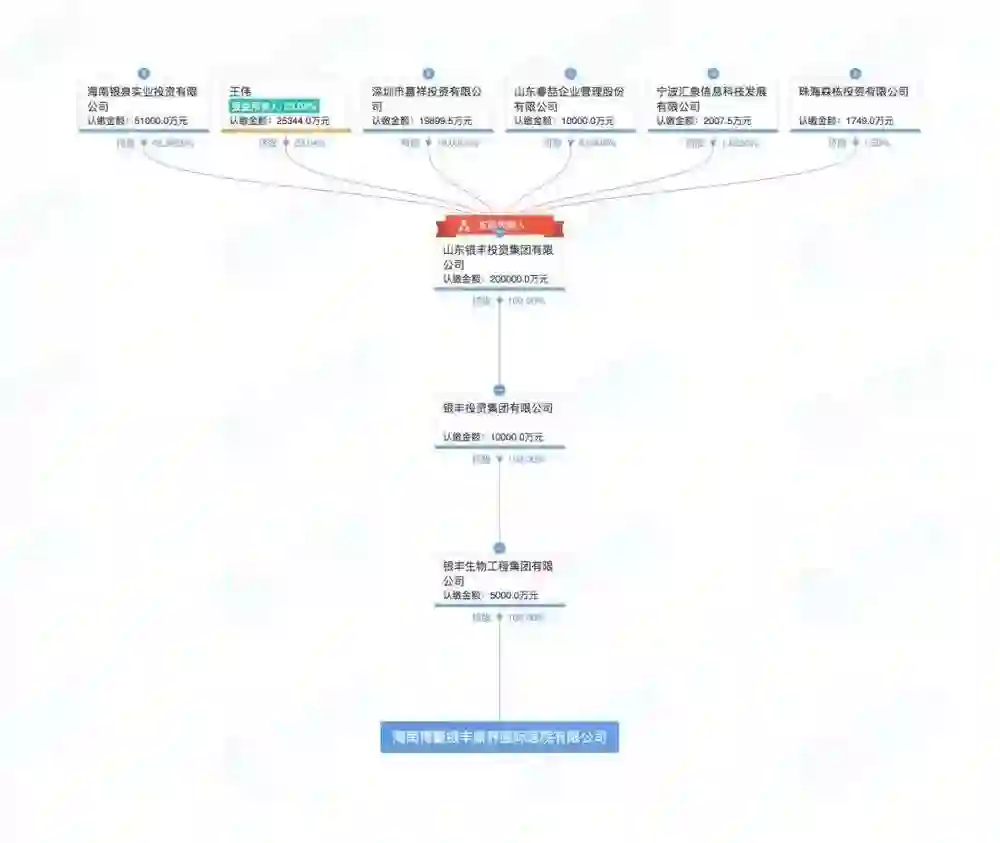 记者在查询启信宝发现,多家公司通过多层结构持有博鳌银丰康养国际医院股权,直接股东是银丰生物工程集团。除了这家医院,该集团还在全国多地开设了干细胞工程、生物工程、医疗科技相关公司。