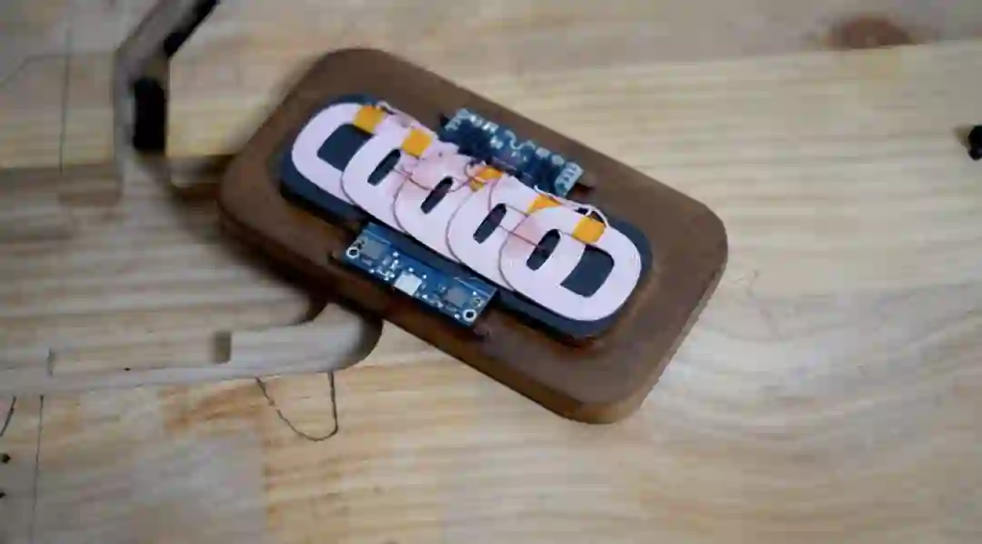 常见的内嵌方式是直接将一块完整单线圈无线充电板塞进桌子,而我这张桌子里面塞得是 五线圈 PCBA,选择一个适合的手腕和设备的距离和尺寸,通过 CNC 在桌板背面开槽,就可以很好的缩短手机和无线充电模块之间的距离。