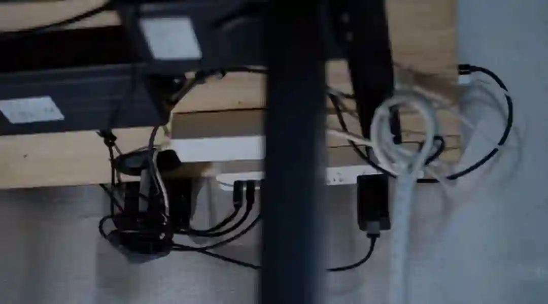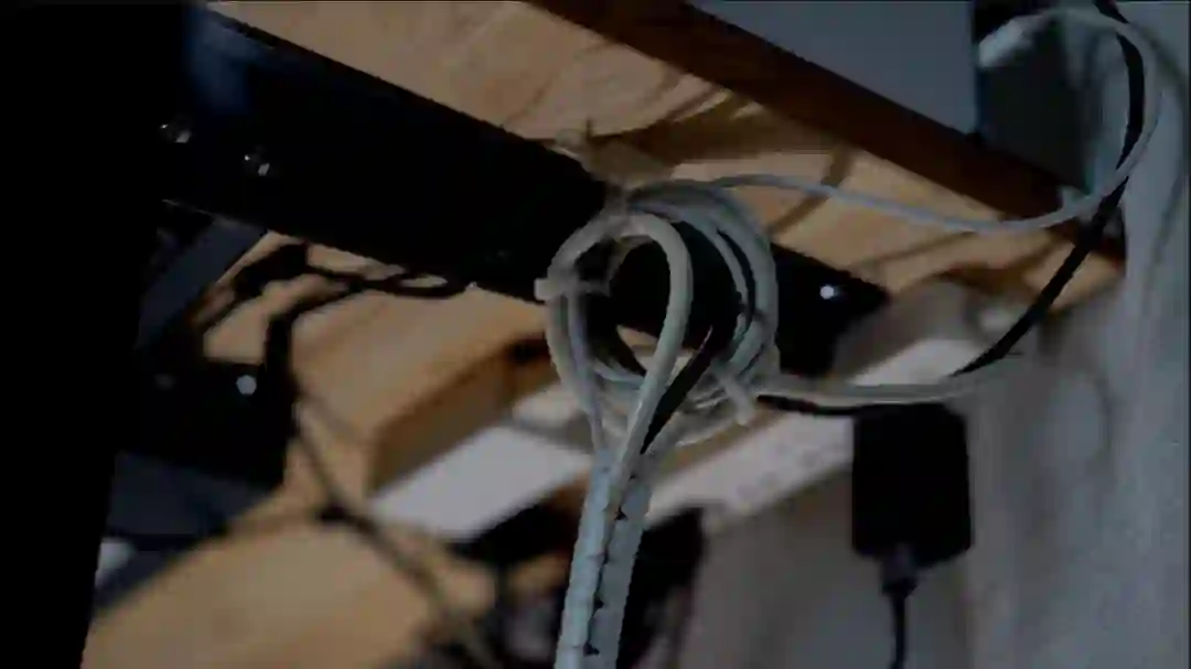 桌底我用了大量的理线夹、扎带还有双面胶。对于比较集中的线我都使用扎带先做一次固定,然后再只用理线夹把它固定在桌板上。而连接电源的线,可以使用线管固定在一起,看起来就更美观了。
