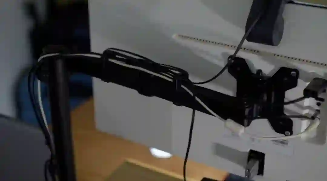 比如显示器支架,我把之前使用的乐歌的支架换成了现在这个淘宝杂牌。说心里话,比乐歌的好用太多了,而且才100块。这个支架有很多走线的卡槽,电源线、HDMI线、还有音频线、灯的电源线都可以通过这些卡槽一步一步走到桌面以下,同时在桌面的正面也看不出来。