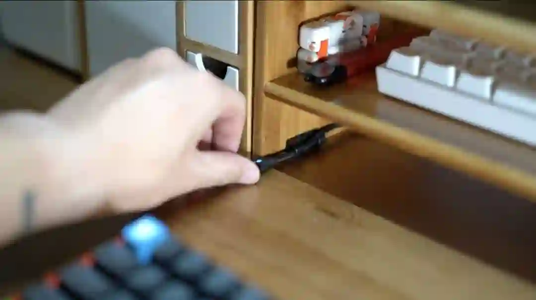 键盘支架除了放置键盘之外,同样也能起到藏线的作用。比如可以在理线架内侧藏一根 Type-C 线用来给键盘充电,用理线夹固定起来,不用的时候往里面一推,完全不用担心线会从后面掉下去。