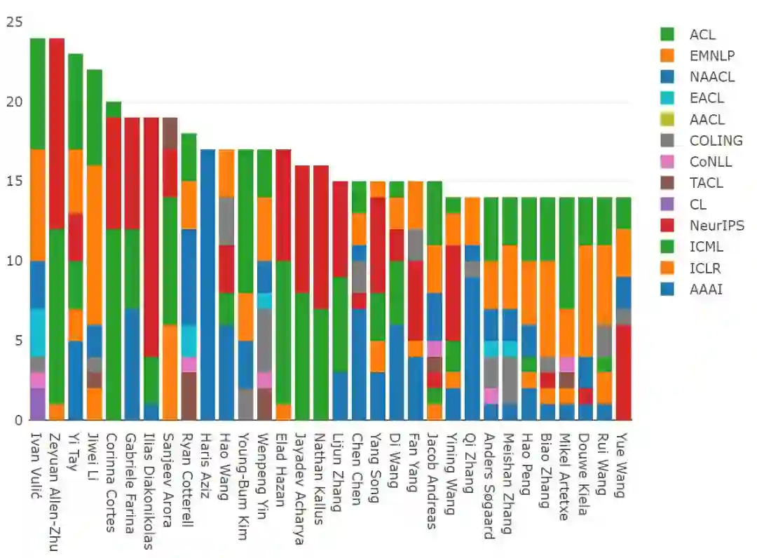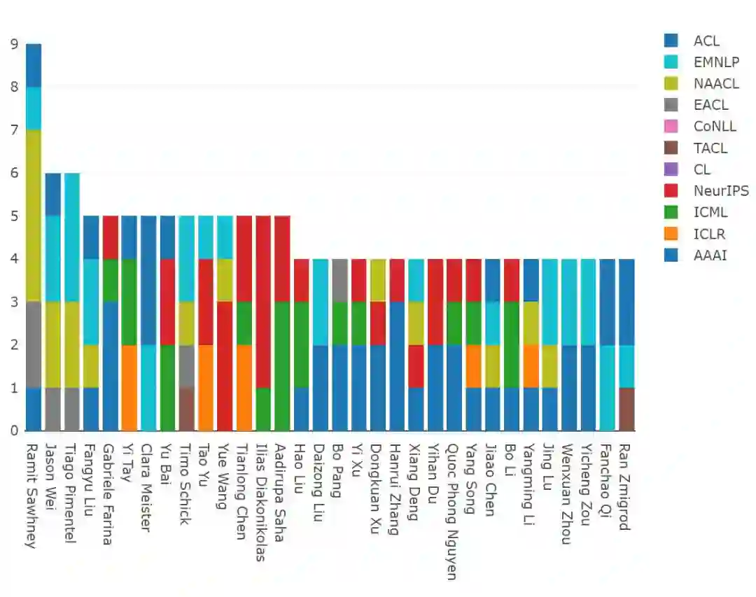 Ramit Sawhney(Tower Research Capital 技术总监)在 2021 年发表了 9 篇有影响力的论文,Jason Wei(谷歌)、Tiago Pimentel (剑桥大学博士生)分别发表了 6 篇比较有影响力的论文。