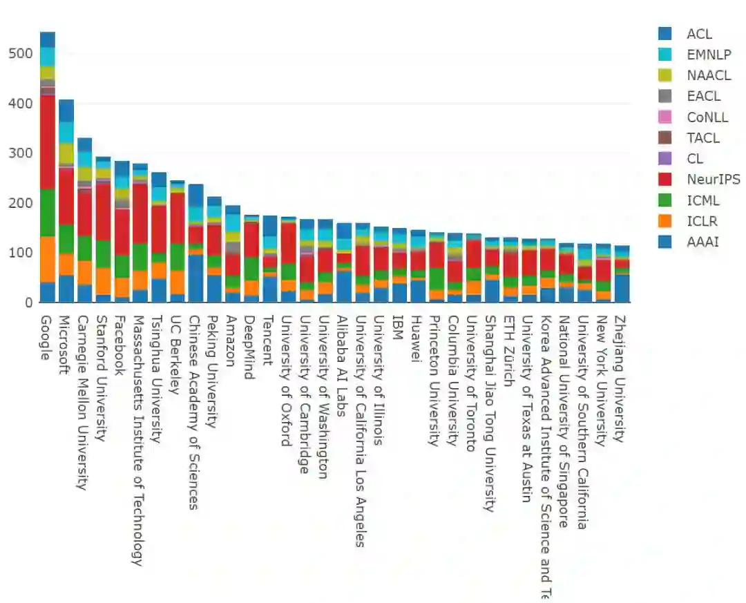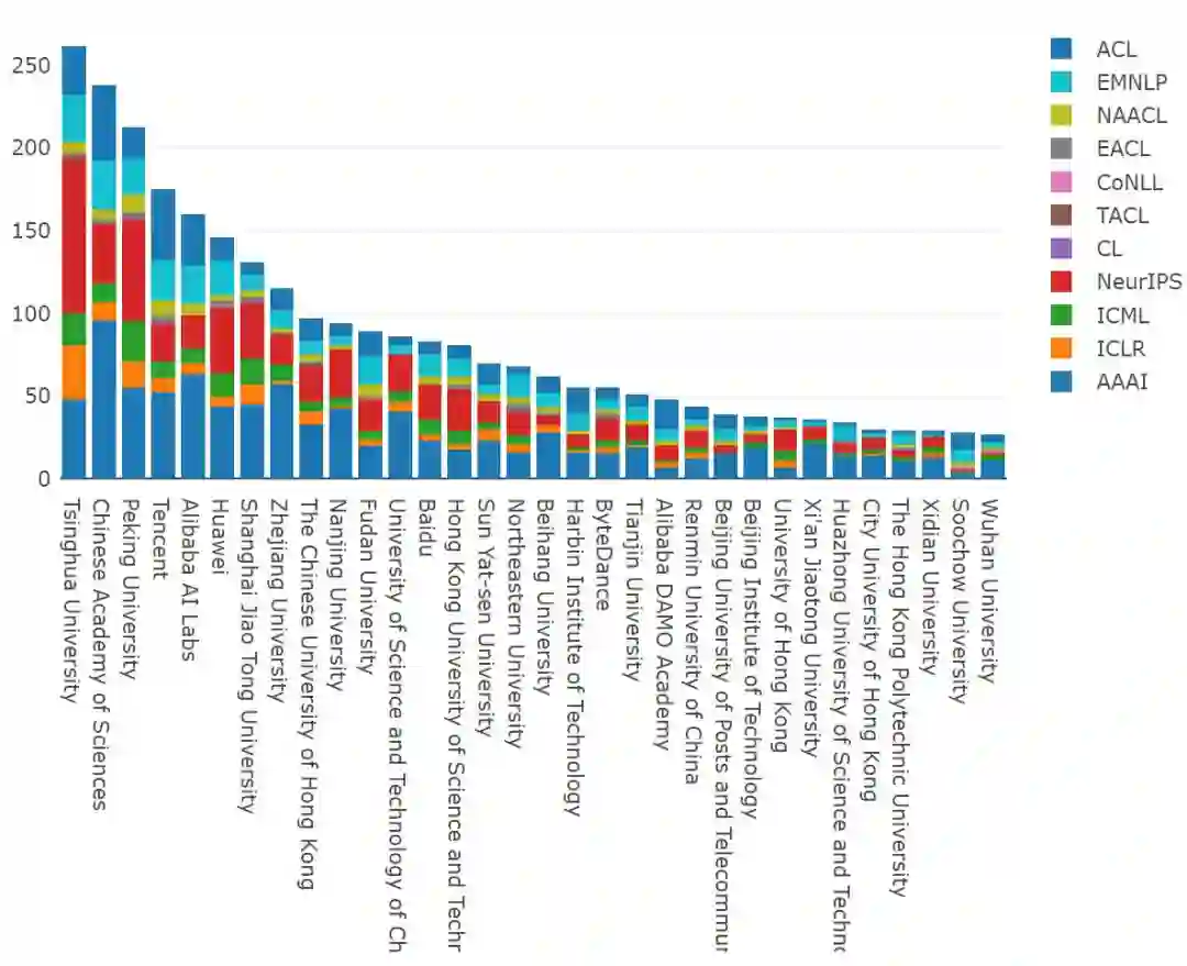 ;微软排名第二;CMU、斯坦福大学、Meta 和 MIT 排名紧随其后,清华大学位居第七。微软、CAS、亚马逊、腾讯、剑桥、华盛顿和阿里巴巴在 NLP 会议上拥有相当大比例的论文脱颖而出,而其他顶级组织似乎主要关注 ML 领域。