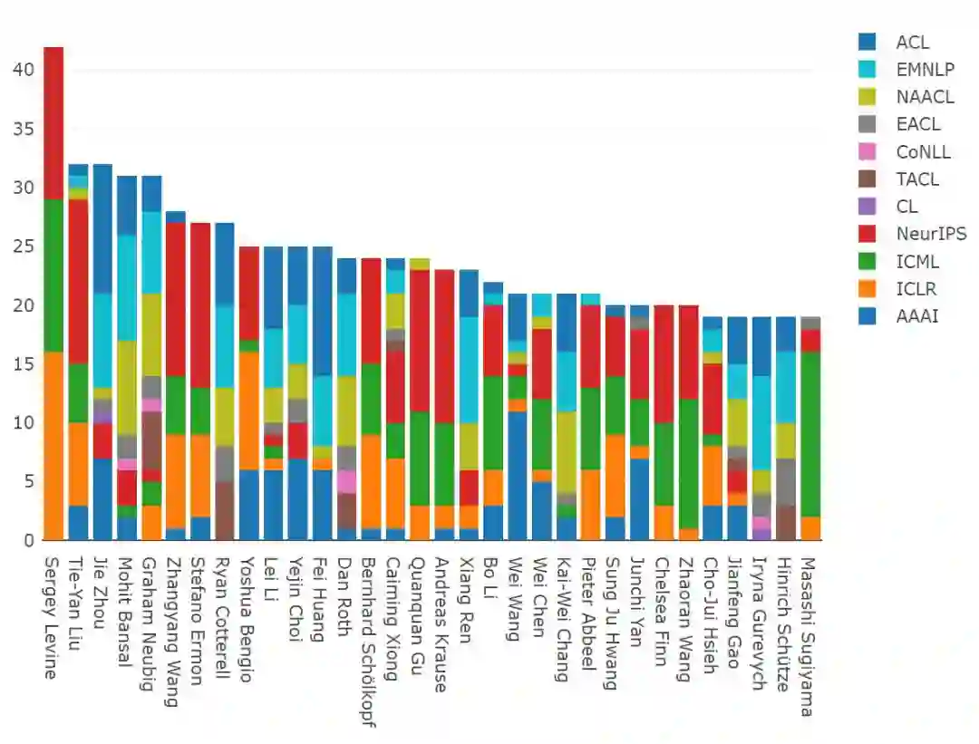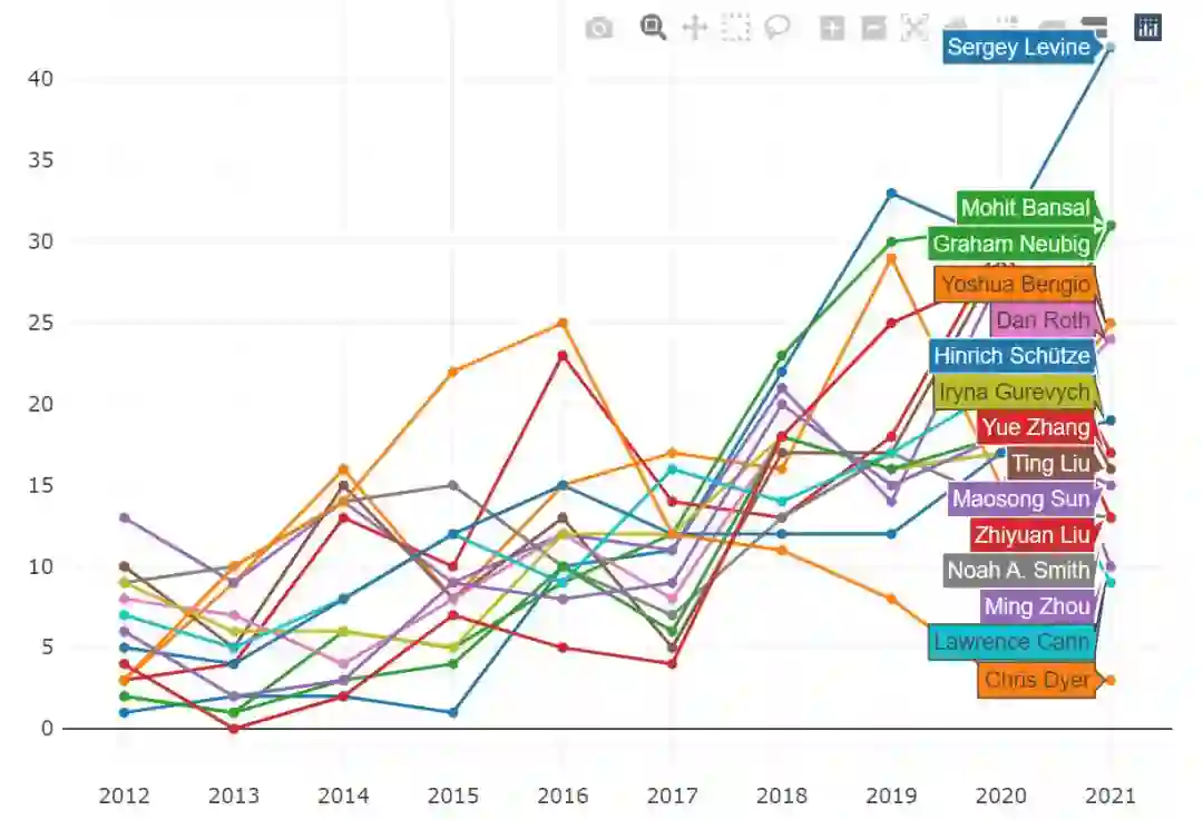 纵观 2012-2021 年,Sergey Levine 发表的论文位居榜首,去年他排名第六,今年一跃排名第一;Yoshua Bengio(蒙特利尔)、Graham Neubig (CMU)、张岳 (西湖大学)、周明 (创新工场首席科学家)、 Ting Liu (哈尔滨工业大学) 等人发表论文数量排名也比较靠前。