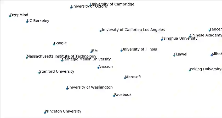 大多数机构还在继续增加其年度出版物数量。谷歌发表论文数量以前呈线性增长,现在这一趋势有所缓解,但仍然比以前发表的论文多;CMU 去年有一个平台期,但今年已经弥补了这一点;IBM 似乎是唯一一家发表论文略有下滑的机构。