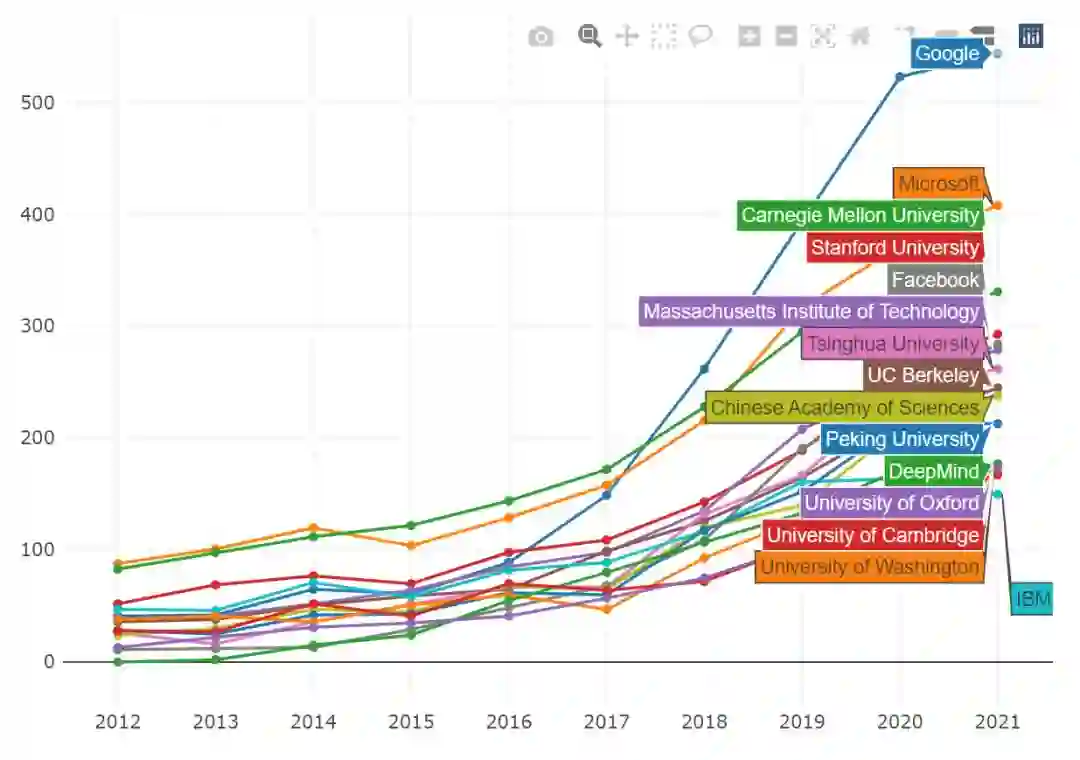 2021 年发表论文数断层式领先的研究机构当属谷歌