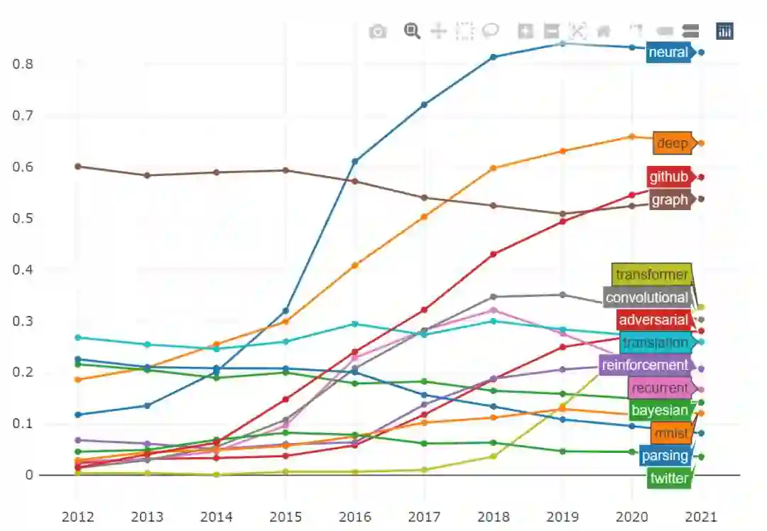 「neural」一词似乎有轻微的下降趋势,虽然你仍可以在 80% 的论文中见到它。同时,「recurrent」和「convolutional」的占比也在下降,而「transformer」一词出现在了 30% 以上的论文中。