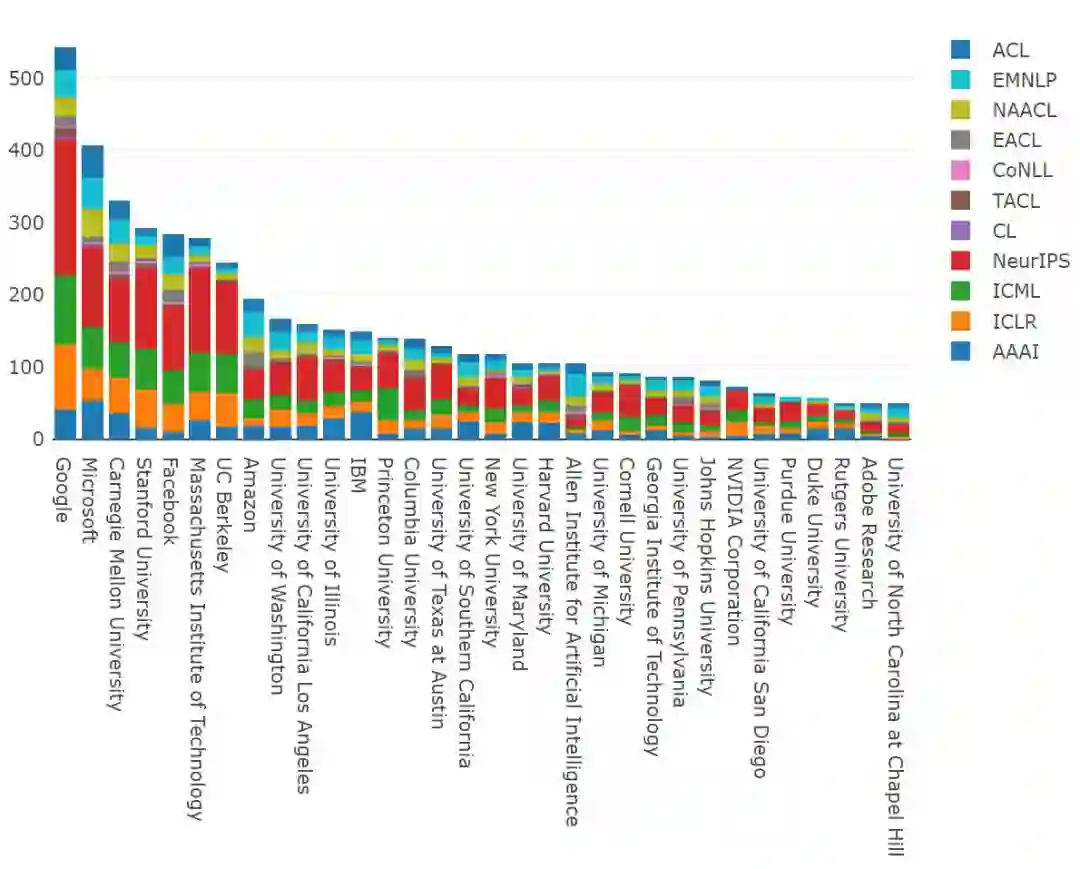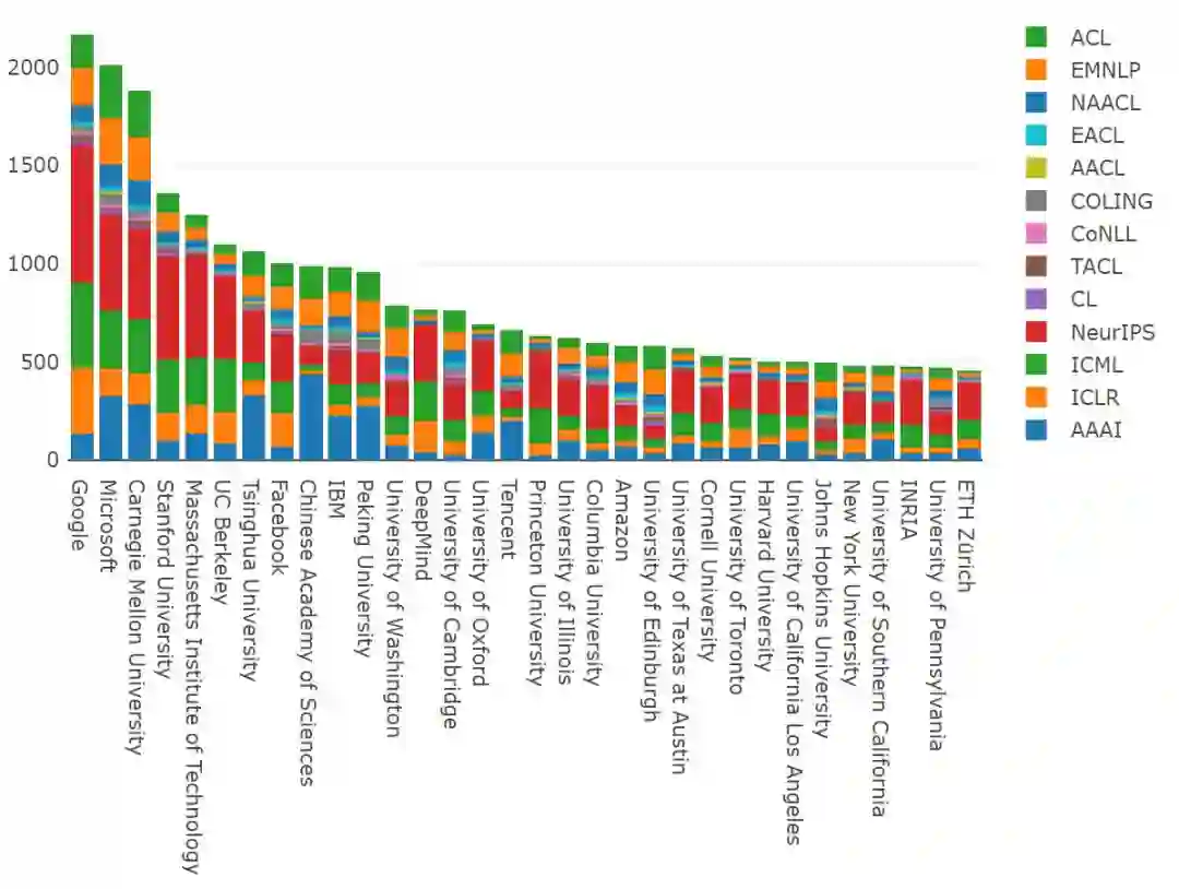在美国,谷歌、微软和 CMU 再次位居出版数量之首。