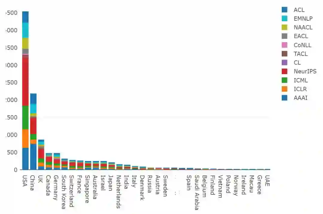 2021 年各国出版物数量,美国出版物数量最多,中国和英国分别位列第 2、第 3。在美国和英国,NeurIPS 所占比例最大,而 AAAI 在中国占比最大。