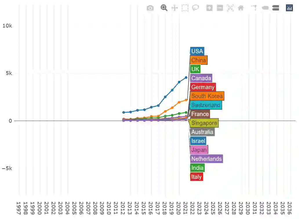 几乎所有排名靠前的国家都在继续增加其出版物数量,并在 2021 年创造了新的记录。对于美国来说,这一增长是最大的,进一步扩大了领先优势。
