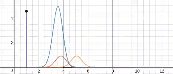 紫色线代表蓝色曲线下的面积,估计概率分布(橙色线),实际概率分布(红色线)
