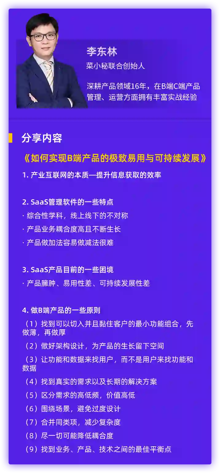 To B SaaS、To C移动互联网领域的连续创业者,拥有16年B端&C端产品管理、运营经验的菜小秘联合创始人@李东林,将和你聊聊如何实现B端产品的极致易用和可持续发展。