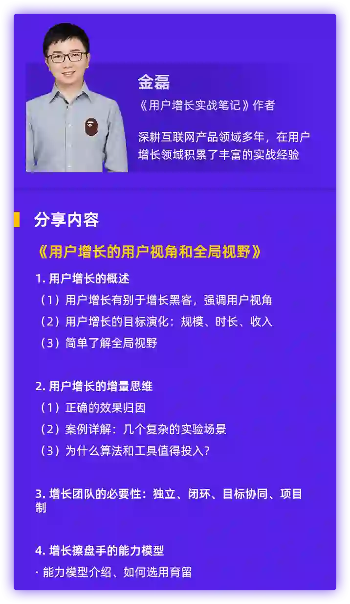 用户增长专家,亲历我国互联网企业由传统用户运营向用户增长转变的《用户增长实战笔记》作者@金磊,将为你带来用户增长的用户视角和全局视野。