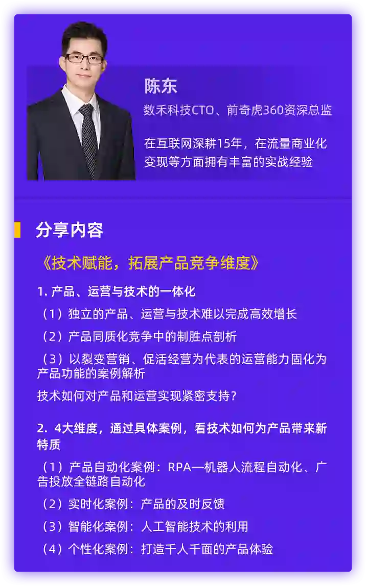 深耕互联网行业10多年,在流量商业化变现、营销与增长、技术赋能业务方面拥有丰富实战经验的数禾科技CTO@陈东,将从技术的视角,聊聊商业增长的一些思考。