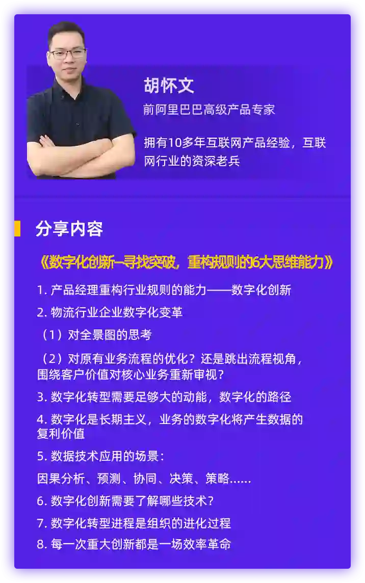 横跨电商、金融AI、在线教育等行业,曾从0到1搭建阿里巴巴B2B印度内贸站、顺丰海淘前后台、供应链等产品的前阿里巴巴高级产品专家@胡怀文,将为你解析数字化创新的6大思维能力。
