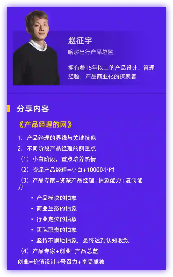既是连续创业者,也是增长体系搭建者、产品商业化探索者,拥有15+年产品管理经验的哈啰出行产品总监@赵征宇,将结合自身经验聊聊他对于产品经理新可能的思考。
