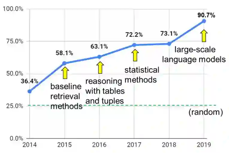 结合不同的解决问题的方法为Aristo将测试分数从2016年的大约60%提高到今年的91.6%扫清了道路。在12年级考试中,该模型得分率为83.5%。