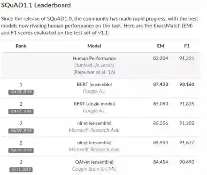 去年年底,谷歌AI团队发布了BERT模型,在机器阅读理解顶级水平测试SQuAD1.1中表现出惊人的成绩:全部两个衡量指标上全面超越人类,并且还在11种不同NLP测试中创出最佳成绩,包括将GLUE基准推至80.4%,MultiNLI准确度达到86.7%等。