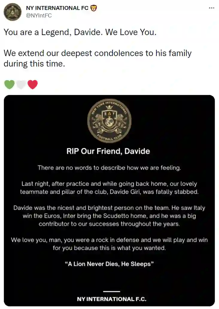 噩耗传来,纽约国际俱乐部官推发文,对Giri的不幸遇害表示哀悼。