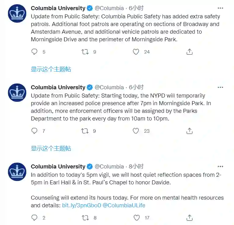 哥伦比亚大学官方也在推特上发布讣告,确认Giri遇害,并表示将根据此后案件调查进度更新相关信息。
