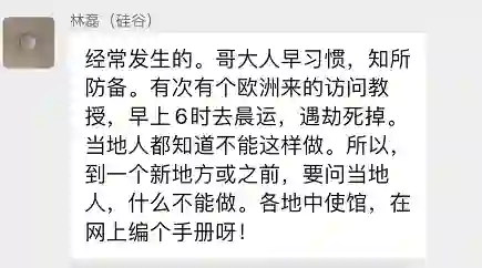 「经常发生的。哥大人早习惯,知所防备。有次有个欧洲来的访问教授,早上6时去晨运,遇劫死掉。当地人都知道不能这样做。所以,到一个新地方或之前,要问当地人,什么不能做。各地中使馆,在网上编个手册呀!」