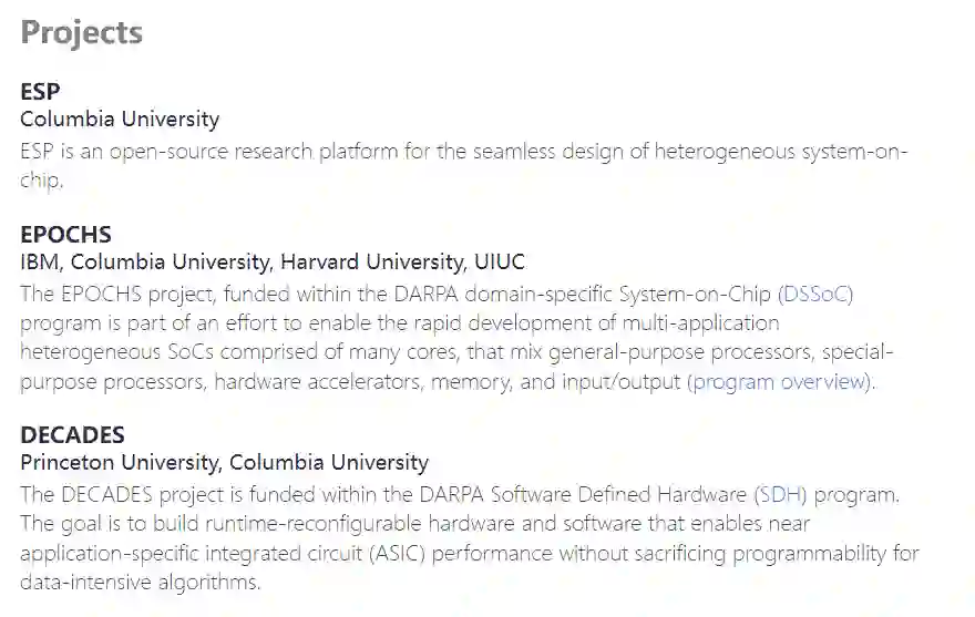 其中包括无缝设计异构片上系统的开源研究平台的开发和设计,以及由DARPA资助的DACADE项目,构建运行时可重新配置的硬件和软件,在不牺牲数据密集型算法的可编程性的情况下,实现接近专用集成电路 (ASIC) 的性能。