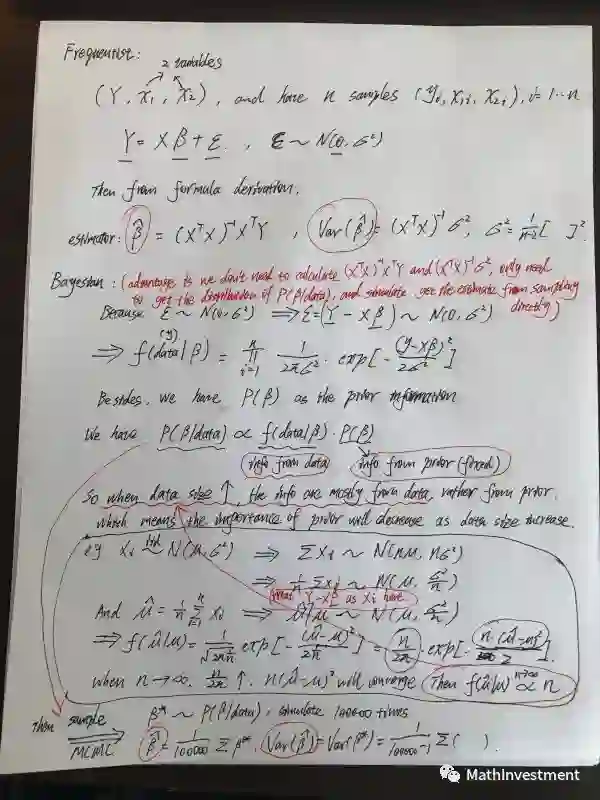 这里用贝叶斯导出的原因是贝叶斯不需要复杂的计算公式,仅仅需要的到P(u|data)之后做simulation,可以直接从generate出来的sample里面得到系数beta的均值和方差,而不需要像frequentist那样用公式来求。(具体公式的推导在附图中)