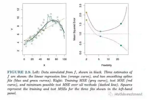 图中的点是从真实的model f(x)产生出来的,我们想做的就是用不同flexibility程度的统计方法去fit这些点,看看哪种方法的拟合效果越好。