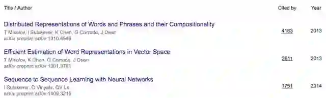 排名第一的是 arXiv 的“计算机与语言”板块(cs.CL)被引用最多的三篇文章,排在第一的是由Tomas Mikolov,Ilya Sutskever,Kai Chen,Greg S. Corrado和Jeff Dean等人共同完成的《Distributed Representations of Words and Phrases and their Compositionality》。