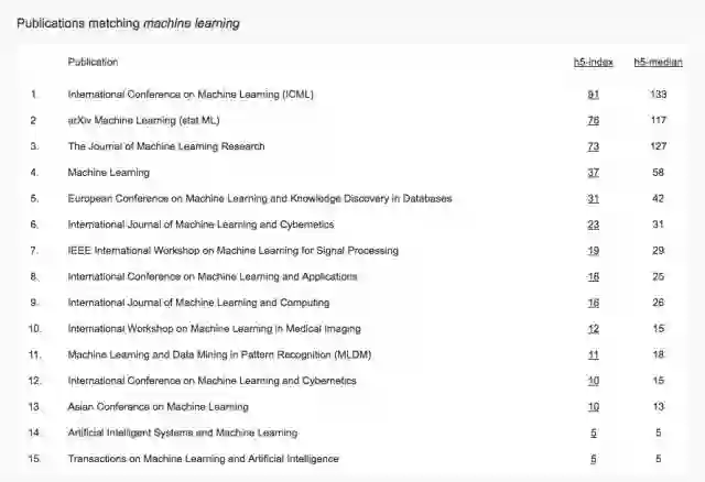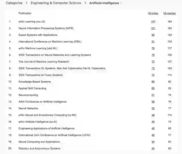 arXiv上计算机科学类以Learning为关键词的文章被排在了这个列表的第一名,H5指数107。顶会NIPS排在了第二名,Expert Systems with Applications 排在第三。