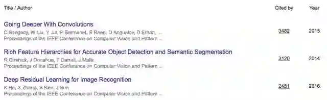 视觉领域的文章被引用得最多的是Christian Szegedy, Wei Liu, 贾扬清, Pierre Sermanet, Scott Reed, Dragomir Anguelov, Dumitru Erhan, Vincent Vanhoucke, Andrew Rabinovich等人共同完成的《Going Deeper With Convolutions》,这篇论文介绍了谷歌的GoogLeNet。