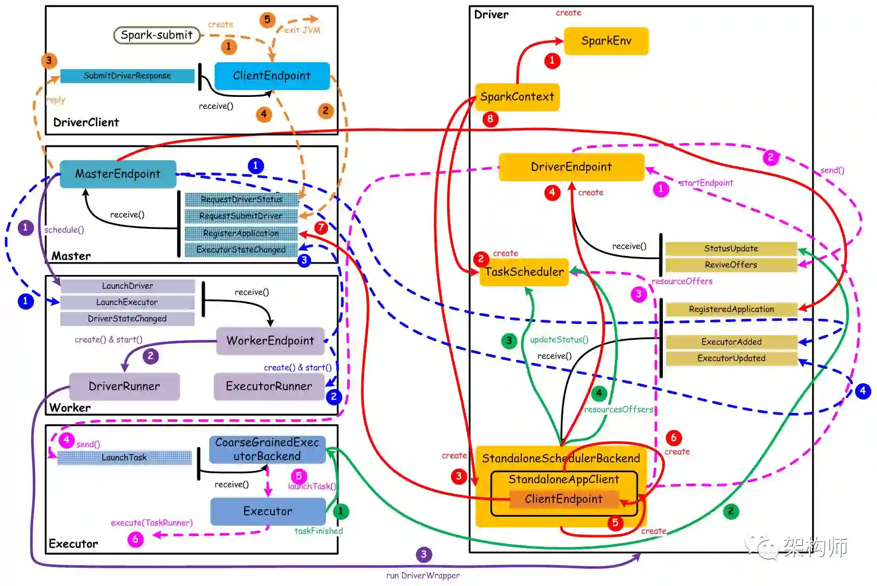 可以看到,Spark集群采用的消息的模式进行通信,也就是EDA架构模式,借助于RPC层的优雅设计,任何两个Endpoint想要通信,发送消息并携带数据即可。上图的流程描述如下所示: