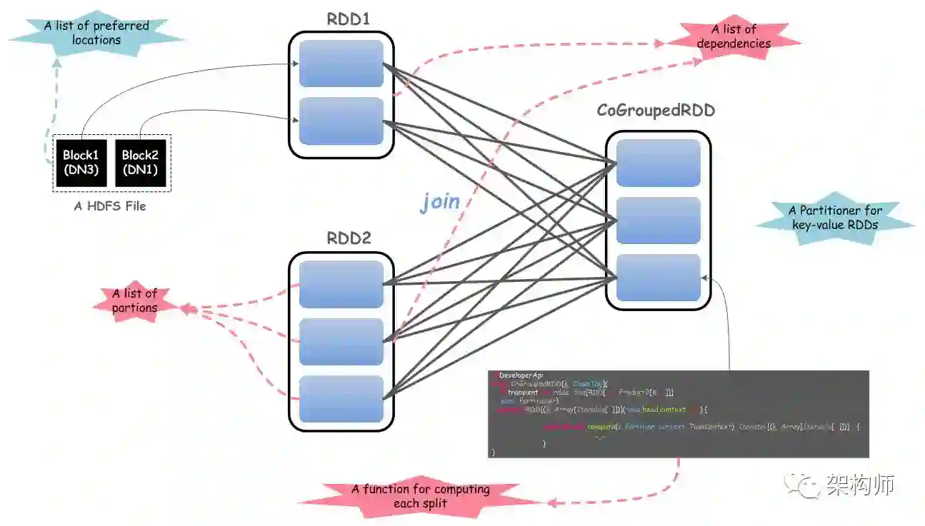 上图展示了2个RDD进行JOIN操作,体现了RDD所具备的5个主要特性,如下所示: