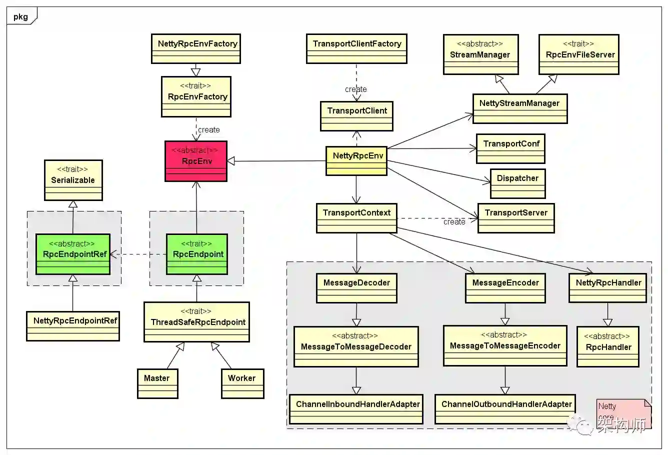 Spark RPC层是基于优秀的网络通信框架Netty设计开发的,但是Spark提供了一种很好地抽象方式,将底层的通信细节屏蔽起来,而且也能够基于此来设计满足扩展性,比如,如果有其他不基于Netty的网络通信框架的新的RPC接入需求,可以很好地扩展而不影响上层的设计。RPC层设计,如下图类图所示: