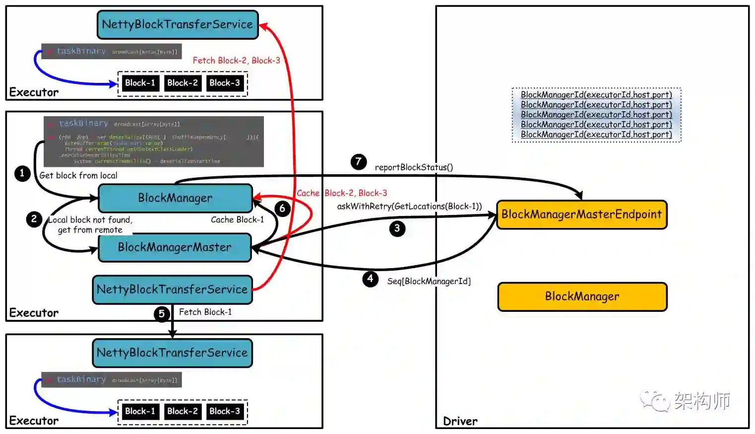 上图中,Driver负责管理所有的Broadcast变量对应的数据所在的Executor,即一个Executor维护一个Block列表。在Executor中运行一个Task时,执行到对应的Broadcast变量taskBinary,如果本地没有对应的数据,则会向Driver请求获取Broadcast变量对应的数据,包括一个或多个Block所在的Executor列表,然后该Executor根据Driver返回的Executor列表,直接通过底层的BlockTransferService组件向对应Executor请求拉取Block。Executor拉取到的Block会缓存到本地,同时向Driver报告该Executor上存在的Block信息,以供其他Executor执行Task时获取Broadcast变量对应的数据。